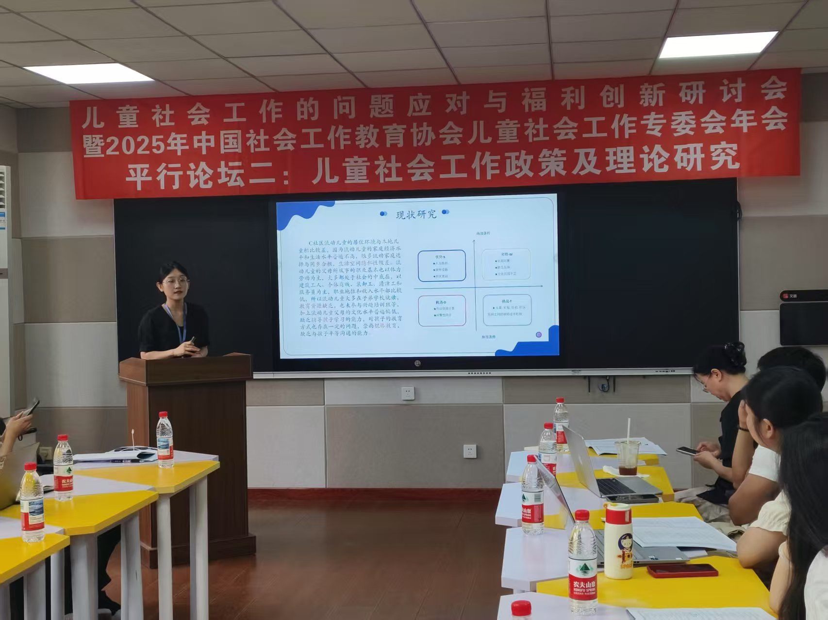 在6月28日下午的“儿童社会工作政策及理论研究”平行论坛中,我校教师代表王楠以《社会工作赋能流动儿童友好社区营造服务》为题,基于多地开展的田野调查,系统阐述了社会工作在整合社区资源、促进流动儿童社会融合中的实践路径。提出的“资源链接-能力建设-社区参与”三阶服务模式,为解决流动儿童城市融入障碍问题提供了可操作的实务框架,引发与会者对社会工作介入城市儿童福利服务的深度思考。