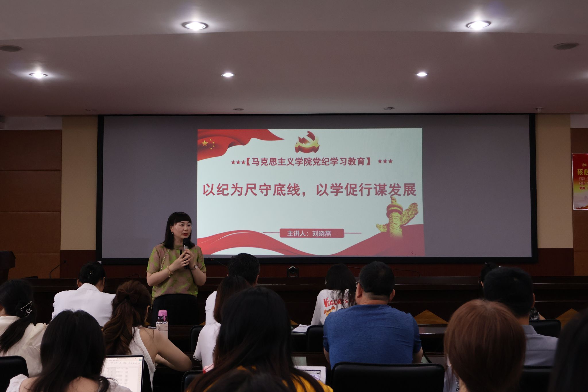 会议中,刘晓燕运用线上、线下教育相结合的方式,组织全体参会教师观看党纪学习教育警示片,以师德师风为切入点,深入学习贯彻习近平总书记关于党纪学习教育的重要讲话和重要指示精神 。会议指出,教育事关国家发展、事关民族未来,是国之大计、党之大计,必须筑牢办学育人战线、忠诚纪律防线。新征程上深入开展党纪学习教育,要以坚决做到学纪、知纪、明纪、守纪的热情凝聚起推动管党治党、办学治校、立德树人等各项工作高质量发展的强大动力,更好担负起为党育人、为国育才的光荣使命。