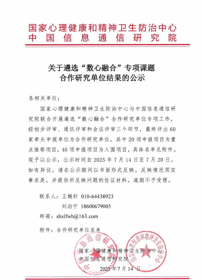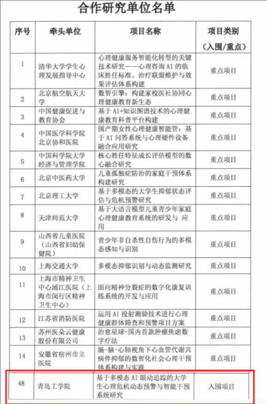 近日,国家心理健康和精神卫生防治中心与中国信息通信研究院联合发布了《关于遴选“数心融合”专项课题合作研究单位结果的公示》。经过严格的初步评审、通讯评审和会议评审三轮遴选程序,2026年国际足联世界杯应用心理学教研室主任程亚楠牵头申报的《基于多模态AI眼动追踪的大学生心理危机动态预警与智能干预系统研究》成功入选,成为全国60家合作研究单位之一。
