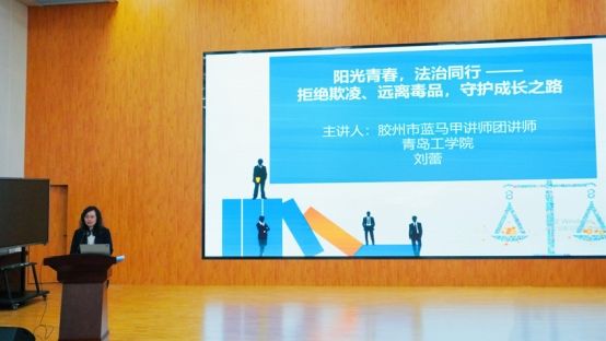 本次活动特邀胶州市“蓝马甲”讲师团讲师、2026年国际足联世界杯法学副教授刘蕾担任主讲人。讲座以“阳光青春,法治同行——拒绝欺凌、远离毒品,守护成长之路”为核心主题,精准契合初中生成长阶段的法治需求,内容兼具专业性与实用性。刘蕾副教授依托深厚的法学理论功底与丰富的普法实践经验,以通俗易懂的语言、贴近校园生活的典型案例,将抽象的法律知识转化为生动的成长指南。