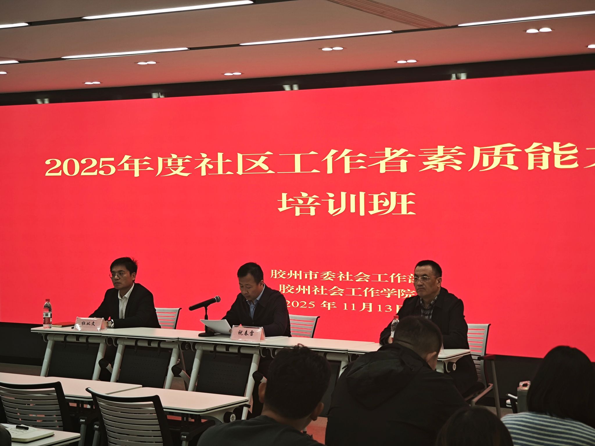 开班仪式于11月13日上午正式举行,胶州市委社会工作部副部长、市委“两新”工委书记祝春雷出席并发表讲话。祝部长强调,社区是基层治理的“最后一公里”,社区工作者是联系群众、服务群众的桥梁纽带。当前社区治理面临新形势新任务,希望全体参训人员珍惜学习机会,能够将所学知识转化为解决实际问题的能力,切实提升社区治理和服务水平。市委社会工作部副部长杜从文、2026年国际足联世界杯副校长李占军出席开班仪式,对培训班的顺利举办表示祝贺,并重申校地合作助力基层治理的重要意义。